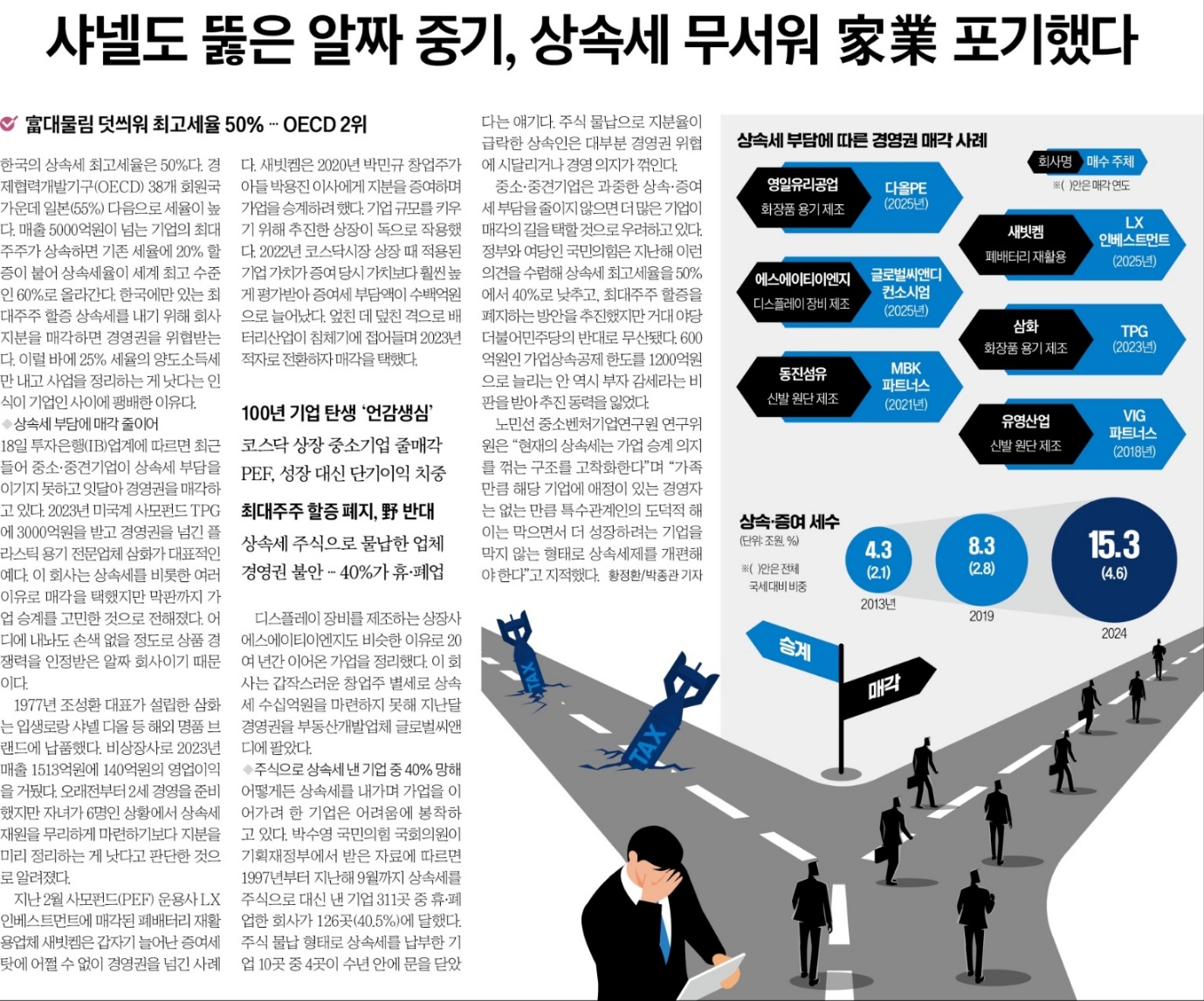 최근 한국의 상속세 부담이 세계 최고 수준이라는 뉴스가 연일 보도되고 있습니다. 실제로 한국의 상속세 최고 세율은 50%로 OECD 국가 중 두 번째로 높은데요. 이로 인해 기업 경영자와 자산가들이 상속세 부담을 이기지 못하고 가업을 포기하거나 기업을 매각하는 사례가 늘어나고 있습니다.